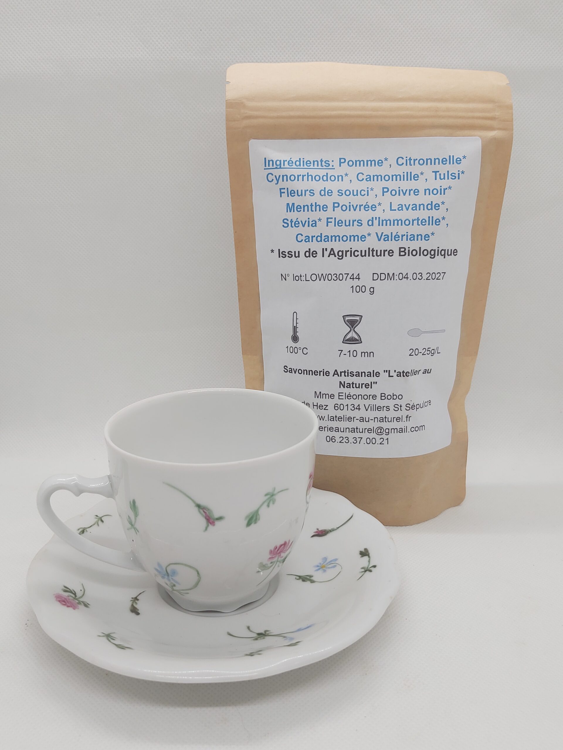 Composition: Pomme, Citronnelle, Cynorrhodon, Camomille, Tulsi, Fleurs de Souci, Poivre Noir, Menthe Poivrée, Lavande, Stévia, Fleurs d’Immortelle, Cardamome, Valériane